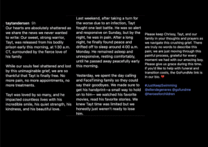 Tayt’s family also released a statement on his Instagram page and Chrissy’s account, sharing the heartbreaking news that Tayt had “been released from his bodily prison early this morning, at 1:30 a.m. CT, surrounded by the fierce love of his family.”