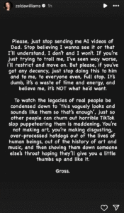 “Please, just stop sending me AI videos of Dad. Stop believing I wanna see it or that I’ll understand — I don’t and I won’t,” Zelda wrote.