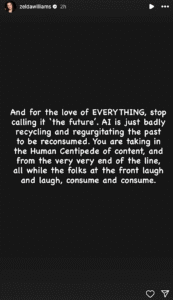 “And for the love of EVERYTHING, stop calling it ‘the future’. AI is just badly recycling and regurgitating the past to be reconsumed,” she wrote. “You are taking in the Human Centipede of content, and from the very very end of the line, all while the folks at the front laugh and laugh, consume and consume.”